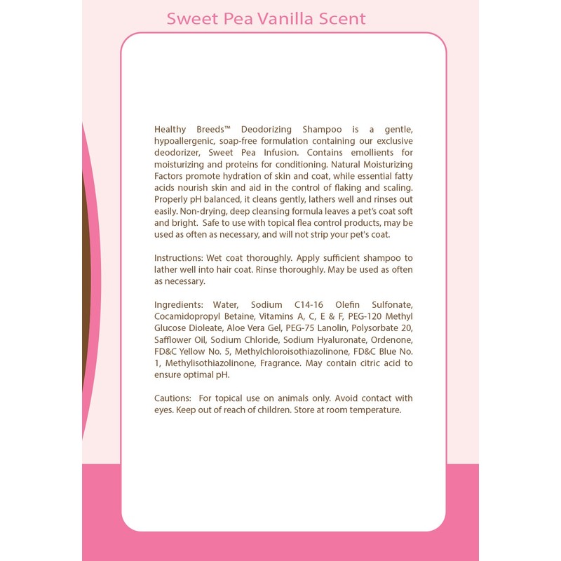 Healthy Breeds Deodorizing Shampoo is a gentle, hypoallergenic, soap-free formulation containing our exclusive deodorizer, Sweet Pea Infusion. Contains emollients for moisturizing and proteins for conditioning. Natural Moisturizing Factors promote hydration of skin and coat, while essential fatty acids nourish skin and aid in the control of flaking and scaling. Properly pH balanced, it cleans gently, lathers well and rinses out easily. Non-drying, deep cleansing formula leaves a pets coat soft and bright. Its safe to use with topical flea control products, may be used as often as necessary, and will not strip your pet's coat.