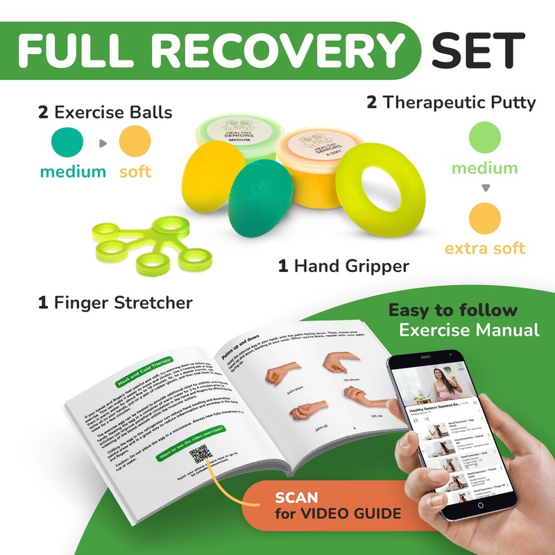 - Printed booklet with 24 exercises - the Healthy Seniors kit comes with a detailed set of exercises designed by a physical therapist to strengthen your fingers, hand, and wrist. You can do your rehab training exercises every day, gradually increasing the difficulty and improving your fine motor skills. Done regularly, these exercises will make it easier for you to grab different objects or do chores around the house, therefore improving the quality of your life.
