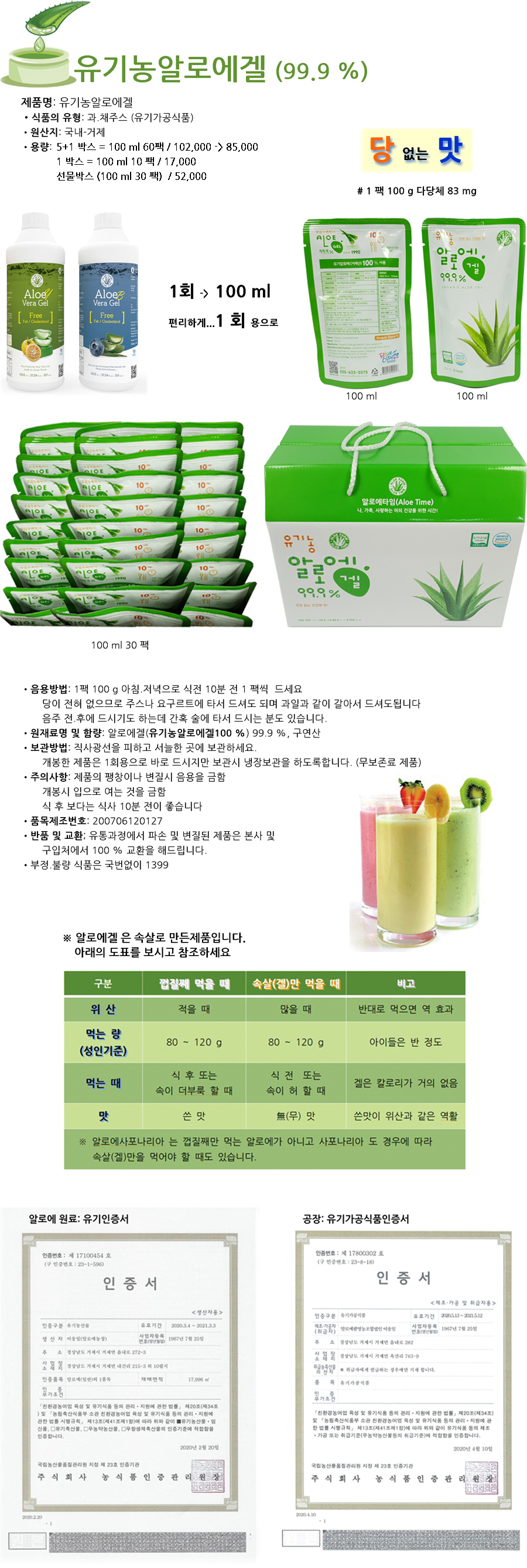 Healthy Time Organic Aloe Gel 99.9% 100ml x 10 packs / 건강한 시간 유기농알로에겔 99.9% 100ml x 10팩