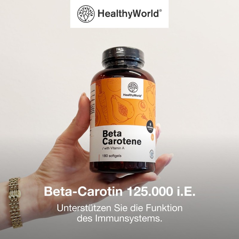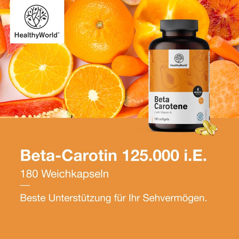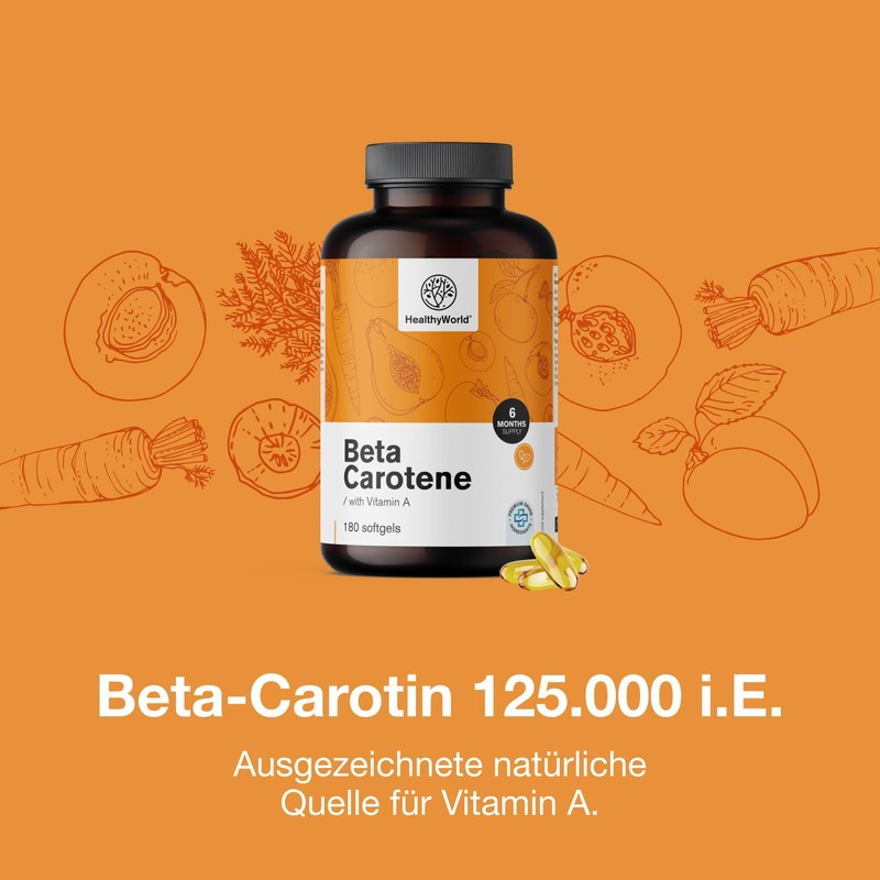HealthyWorld Beta-Carotin 125.000 i.e. – 25.000 μg Vitamin A pro Dosis – 180 Weichkapseln – 6 Monate Vorrat – Glutenfrei und Laktosefrei – Unterstützung für das Sehvermögen und das Immunsystem