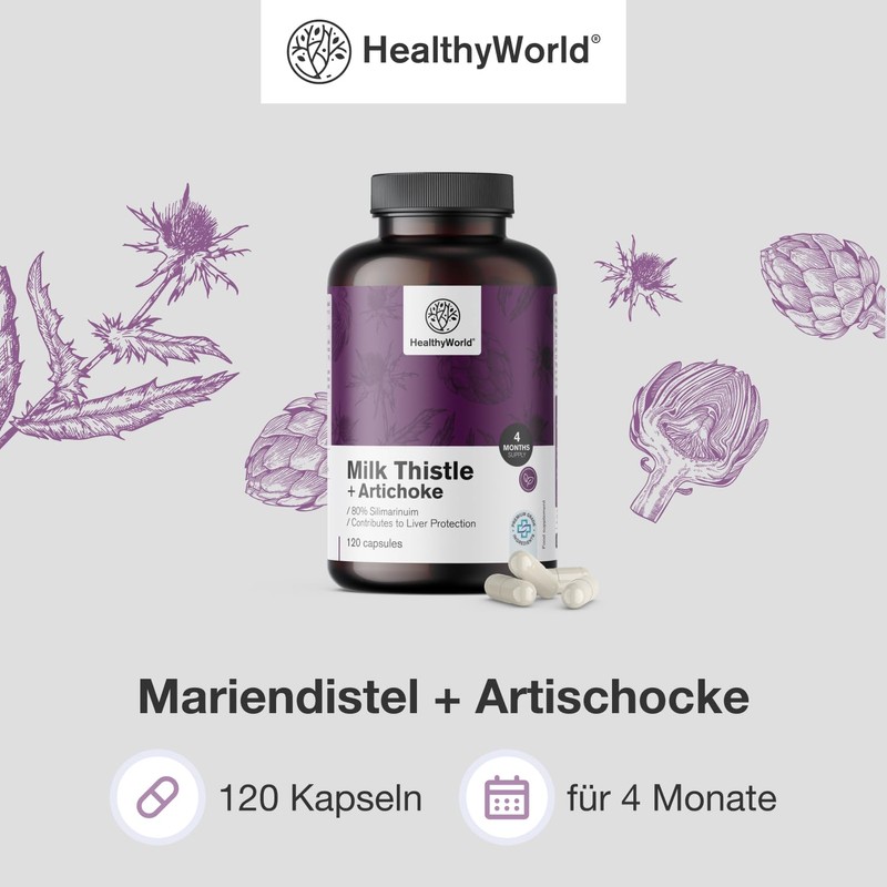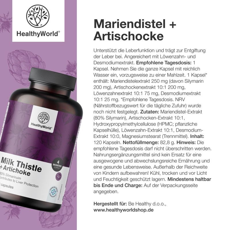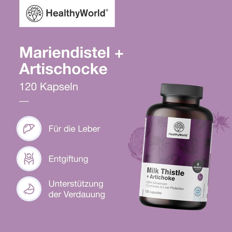 HealthyWorld® Milk Thistle + Artichoke Capsules - Liver Support & Detoxification - 120 Plant Capsules - 4 Month Supply - High Dose with 80% Silymarin - With Artichoke, Dandelion and Desmodium