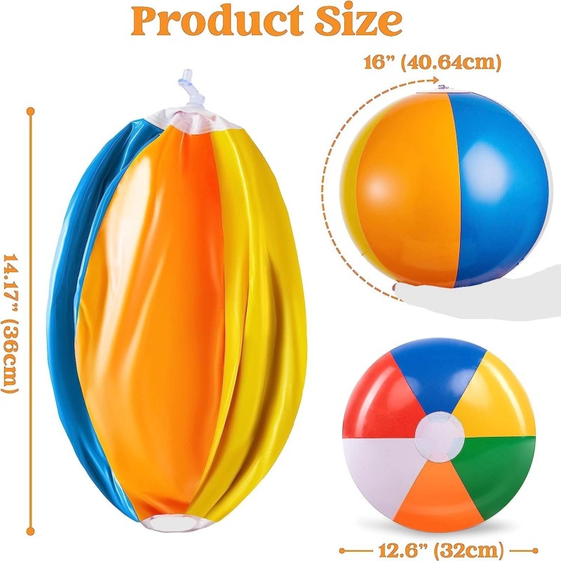 8 Pack, 16" Inflatable Beach Balls, Large Rainbow Beach Balls Bulk for Pool Parties, Kids and Adults Summer Pool Party Toys, Beach Toys, Party FavorsSUPER VALUE PACK. Our beach ball favors Set includes 12 Packs of Inflatable Beach Balls in 16" deflated size. The kids will have a great time kicking them and chasing them outside.PREMIUM QUALITY. Our beach ball party favor set is well heat welded for anti-air leaking, made of high quality Child-safe non-toxic material which is durable for several summer uses.EASY TO USE. Our beach ball set is easy to inflate and deflate, blow up beach balls with an air pump, but you can also blow up beach balls with your mouth. Perfect for traveling when deflated, our pool beach ball set brings the perfect summer spirit to your beach trip!IDEAL FAVOR & GIFT. These inflatable beach balls are the Favorite summer toy for indoor and outdoor pool games, also perfect for beach ball party decorations & rainbow party décor, end-of-year teacher gifts for students, and more!