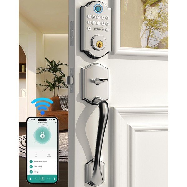 HEANTLE Keyless Fingerprint Door Lock Set WiFi Front Door Lock with Handles - Alexa Smart Electronic Digital Keypad Deadbolt Sets App Remote Control Auto Lock Satin Nickel