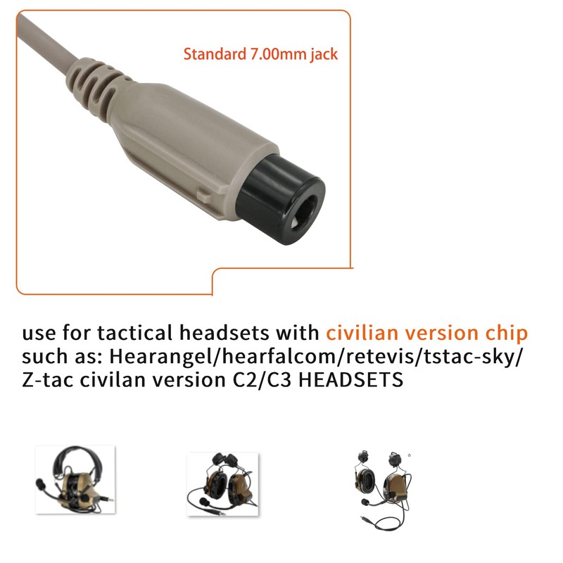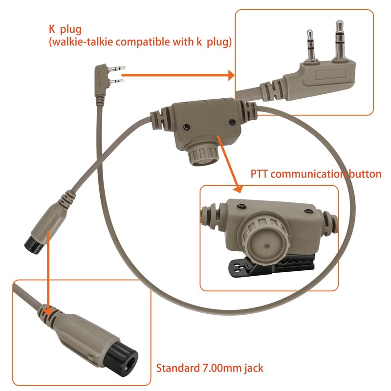 - K-plug ptt 2 pin - Push to talk is Compatible with tactical headsets(civilian version)which have plug 7.00mm jack , Compatible with radi has k-plug 2 pin slot.Jack for radio is 3.5mm plug K-plug 2 pin, built-in civilian version of the chip, not for the military version of the tactical headset.