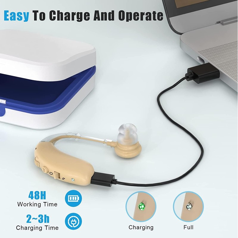 - QUICKLY CHARGE:Hearing amplifier charging about 2 - 4 hours can be full and about 48 hours can be used, hearing assistance devices allows you to easily communicate with others, Provide a "boost" for your better life. (Tips: It is USB rechargeable hearing assist without frequent battery replacement)