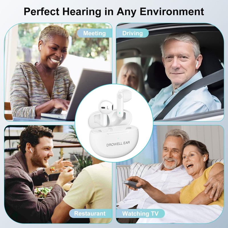 - 【Comfortable and Discreet】DROWELL EAR hearing amplifiers for seniors provides an enhanced fit and can be worn firmly on the ears. A single hearing aid weighs only 3.45g, lightweight and small, so there is no burden to wear our hearing aids for adults. The fashionable style looks like headphones, just wear it with confidence and no need to hide.