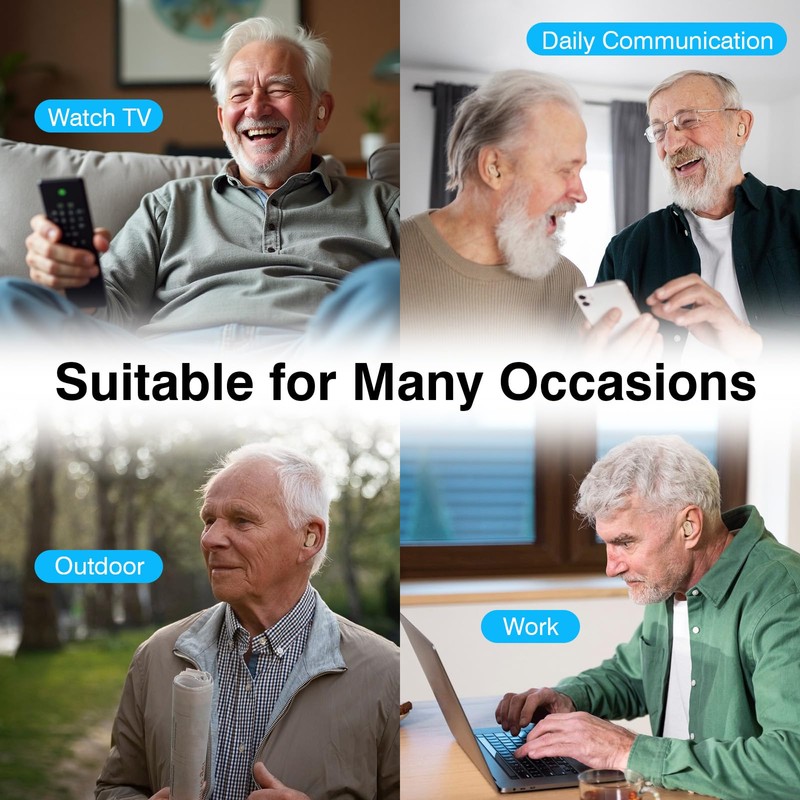 - Smart Noise Cancellation: Wave goodbye to background chaos. Powered by an upgraded digital chip and 16-channel noise processing, our hearing aids intelligently analyze your surroundings to eliminate annoying whistling or buzzing, delivering stereo sound that immerses you in crystal-clear conversations.