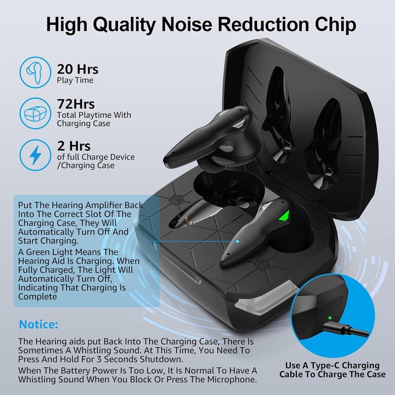 - 【Rechargeable Hearing Aids】 Hearing aids rechargeable take 2-4 hours to fully charge and can be used at least 72 hours after one single charge. Put the rechargeable hearing aid in the charging case so that hearing device can be charged in time when the battery runs out; Large capacity, the hearing amplifier aid has a battery life of 6 years.