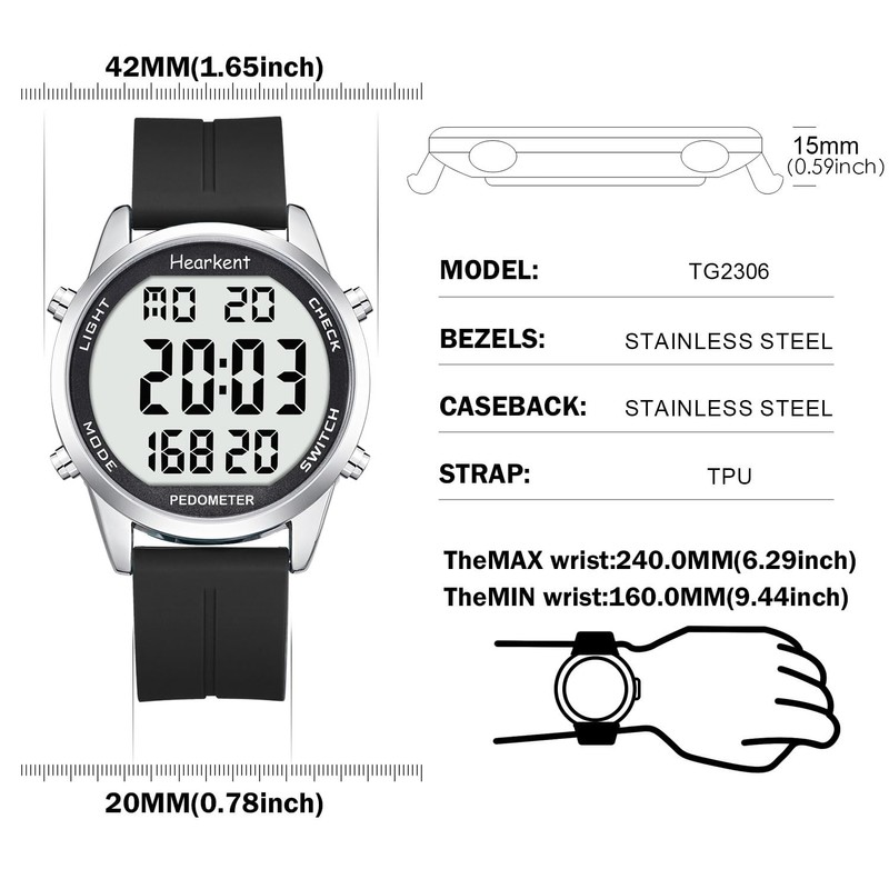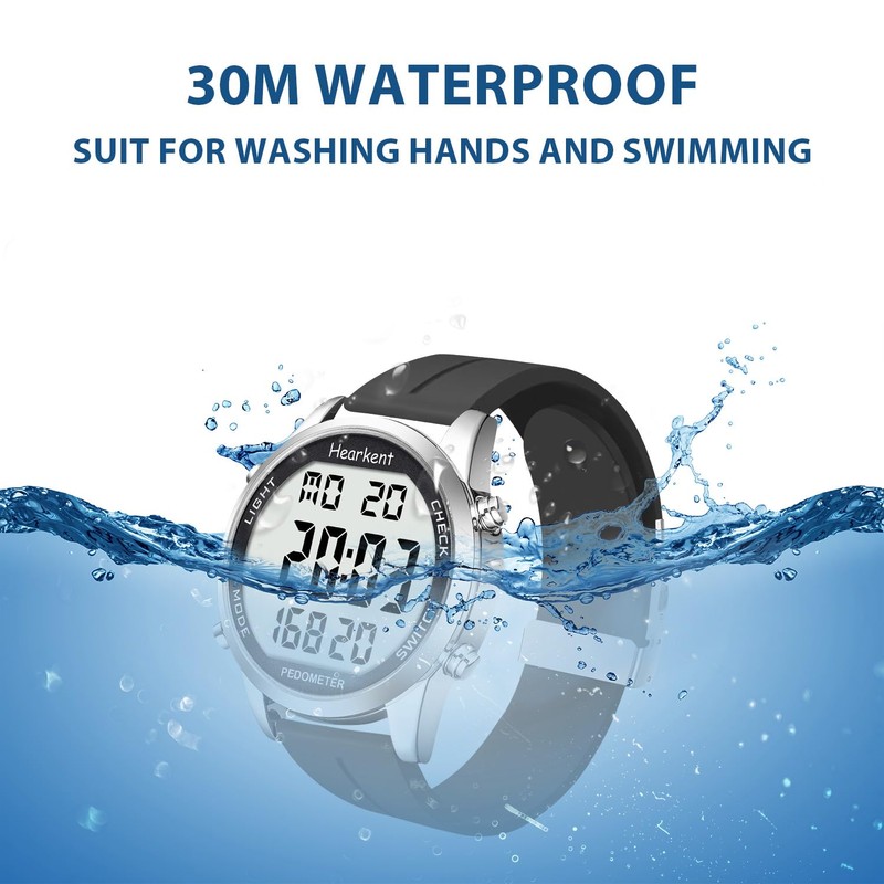 The Hearkent pedometer watch is a simple yet effective for tracking your daily activity. With its pedometer function, you can easily count your steps throughout the day to reach your goals. In addition to step counting, this watch also includes useful features like a stopwatch, alarm, and backlight so you can check the time anywhere, even in low light conditions. Water resistant down to 30 meters, you don't need to worry about wearing it during workouts or in the rain. Along with step count, the watch also displays calories burned and distance traveled to give you a full picture of your exercise progress. With its easy-to-read display and simple one-button operation, this pedometer watch makes it effortless to watch from your wrist.