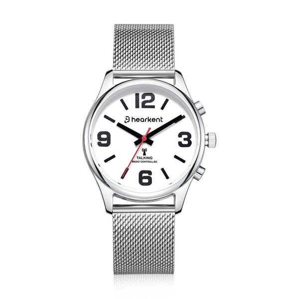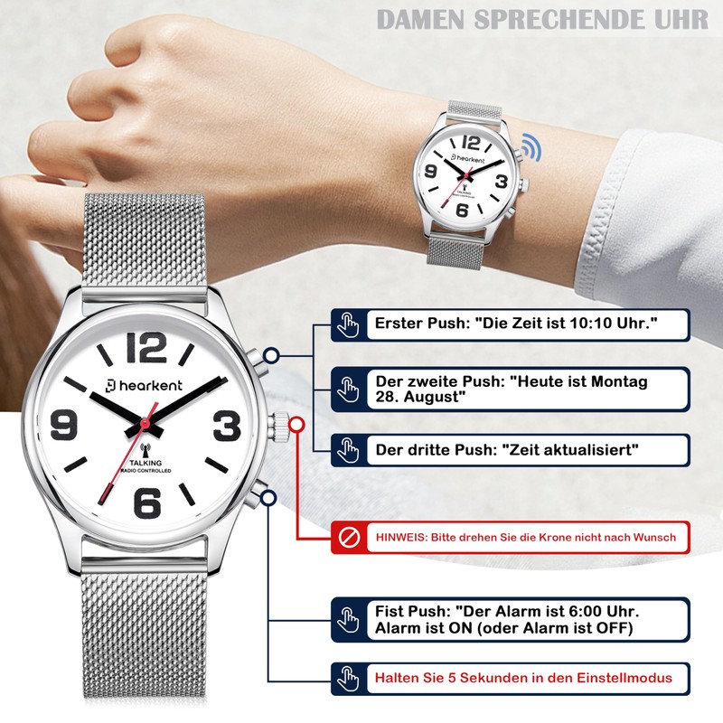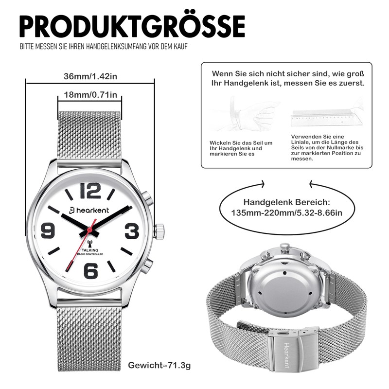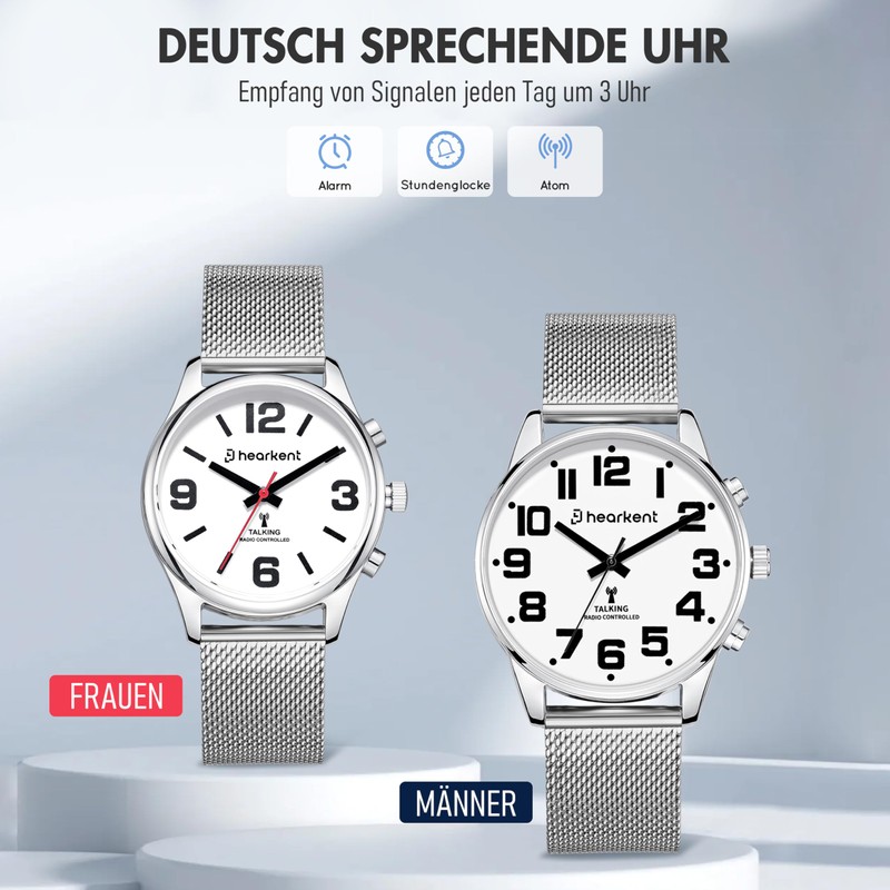 Hearkent Talking Watch, German Voice Prompt, Large Numbers, Self-Adjusting Talking Watch, Gift Ideas for Seniors, Blind, Visually Impaired People, Built-in Alarm/Hourly Chime, Silver, Band 18 mm