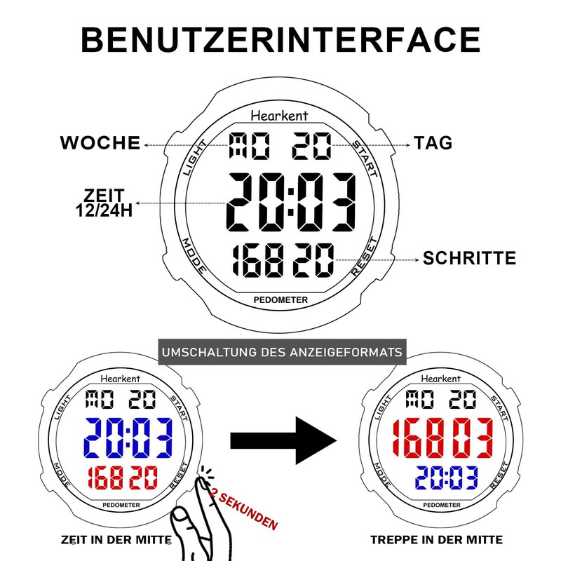 - 50 m waterproof: suitable for hand washing and swimming. It offers a variety of useful functions such as time, date, week display, alarm, hourly ringing, pedometer, calorie counter, stopwatch, countdown timer.