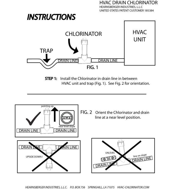 Preventdrain line clogging and related damage to your walls and flooringwith Hearnsberger Industries HVACChlorinatordrain cleaner. Pre-filled with 1’’ tablets,our HVAC chlorinator creates a constant mixture of chlorinated waterin your drain line that keeps it free from clogs. The powerfulchlorinated mixture stops the accumulation of standing water nearindoor units and prevents water damage and musty, moldy smells nearyour unit or in the air from the vents.