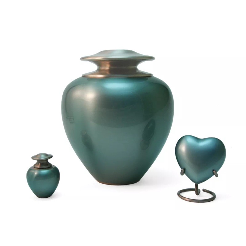 Inspired by the Japanese term of awakening and understanding, this brass cremation urn from our Satori Collection honors that your loved one is deeply and forever a part of you. This heart shaped keepsake size piece comes full circle with a high gloss teal finish. This also includes a soft velvet box in a rich blue tone.