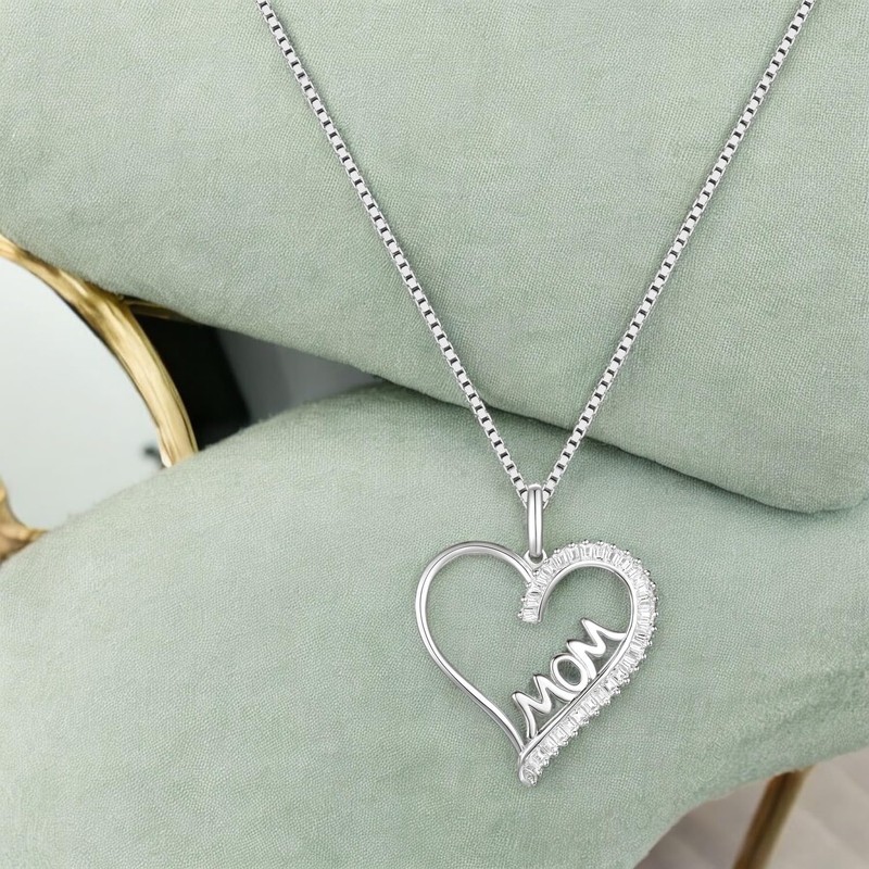 Heart Mom Pendant With Baguette .20CT Diamond In Sterling Silver 18"