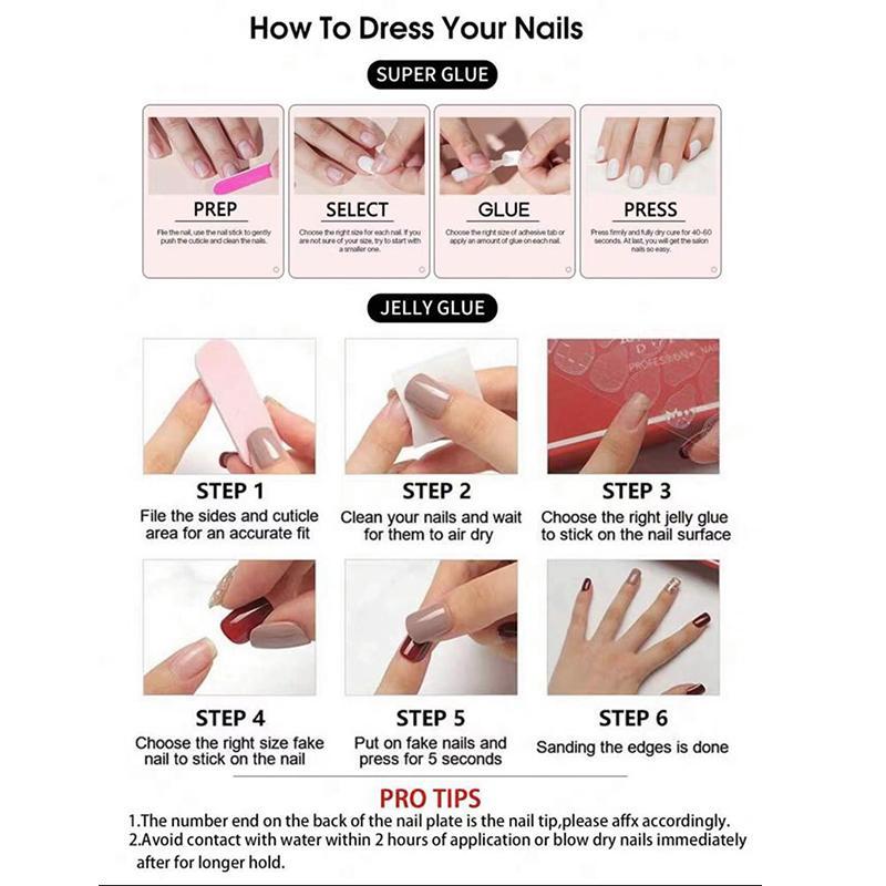 【Complete Manicure Set】: This set includes not only the fake nails but also jelly glue and a nail file, providing everything needed for a chic DIY manicure.