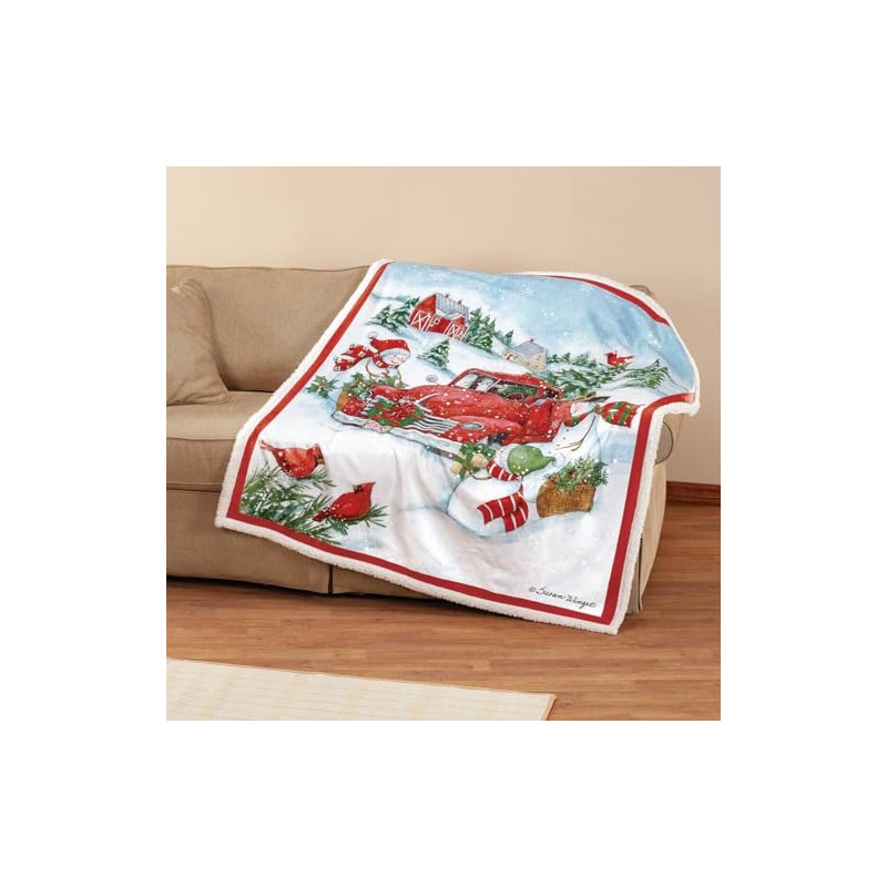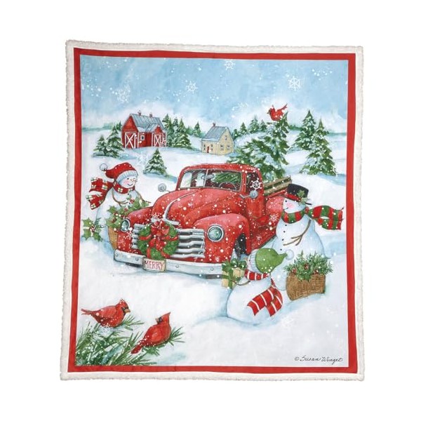 Heartwarming Susan WingetTM Truck and Snowmen Sherpa Throw Blanket - Perfect for Cozy Christmas Movie Nights - Beautiful Winter Design with Soft Sherpa Back - Generous Size 50" x 60" - 100% Polyester