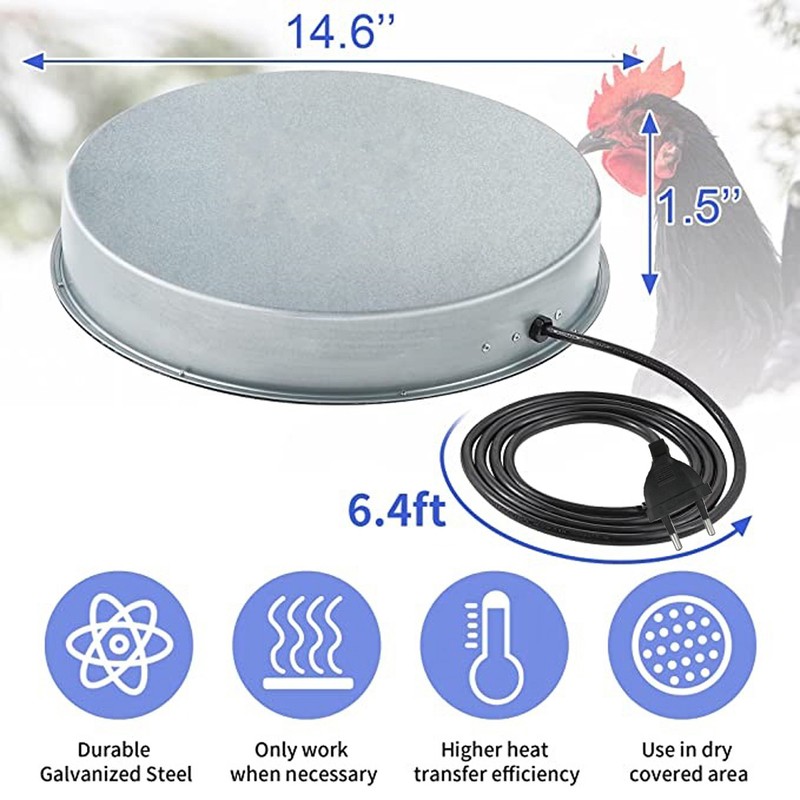 1、[Automatic chicken water heater] AC 60HZ 125W, a heating chicken water heater can only be controlled by constant temperature, only operate when necessary, to avoid freezing water due to 0 degrees Fahrenheit or cold weather, and provide more care for your poultry. 2、[Heavy duty and constant temperature] Galvanized steel base surface and high‑density aluminum lining, good thermal conductivity, best use, to ensure safety, add an additional thermostat, which can operate continuously in the circuit, when the heating base temperature exceeds 60 degrees Fahrenheit (25 degrees Celsius), the power will be automatically disconnected to ensure safety. 3、[Safety for chicken] The built‑in heating cable complies with UL standards, and the heating base is equipped with a power cable, so if it is locked on the wire, the chicken will not be injured, and protect curious chickens, ducks or birds safely in the barn, Safety in huts, nests or outdoors. 4、[Plug and play] The livestock heating water dispenser has no spare parts to replace, just plug in the power supply, and your chicken or farm animals can enjoy mild‑warm water within a few minutes. 5、[Wide application] It is very suitable for small animals. The low‑wattage heating base is suitable for outdoor pickups and freezing winter temperatures and provides consistent mild hot water, which will not burn your dog, cat, or animal's mouth.