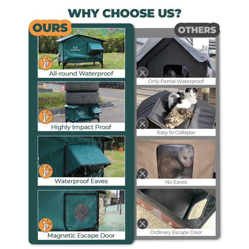 - ๐๐ฎ๐ญ๐๐จ๐จ๐ซ ๐๐๐ญ ๐๐ฎ๐ฌ๐ญ ๐๐๐ฏ๐-The outdoor cat house with eaves has greatly improved the overall waterproof effect, and rain from any direction can be kept out of the door.The two exits provide multiple escape routes from predators to prevent feral cat from being trapped.Elevated base ensures their dryness even on muddy ground.