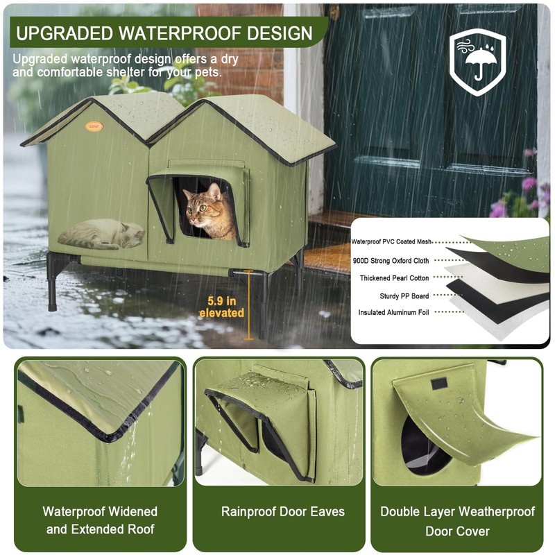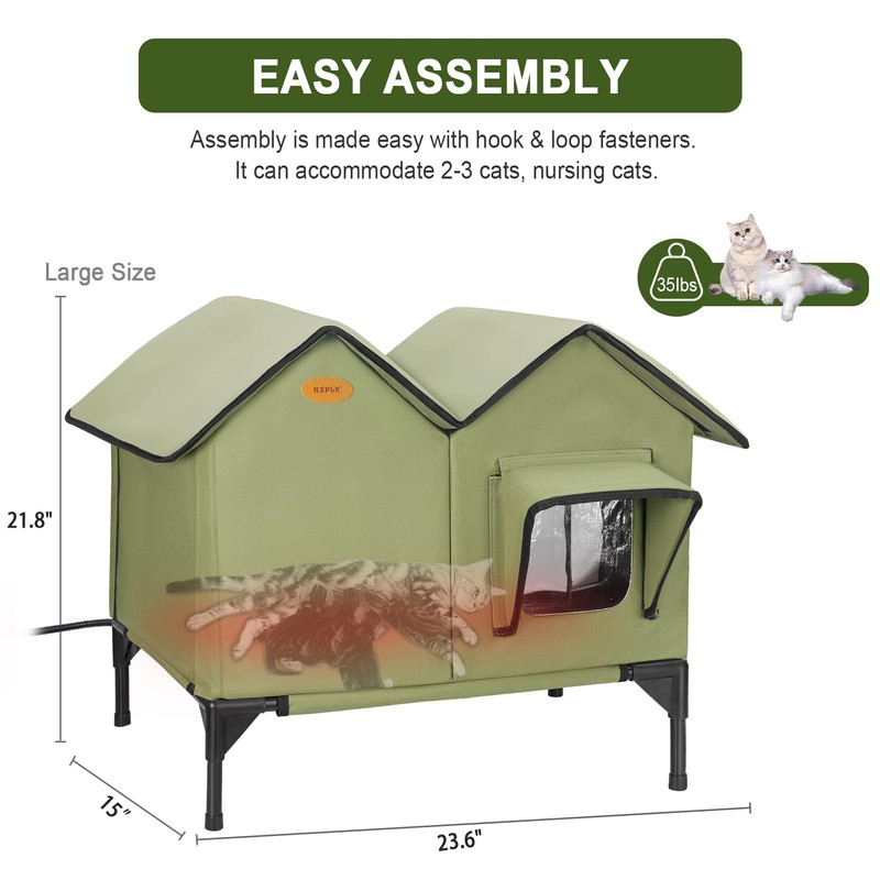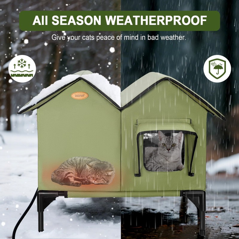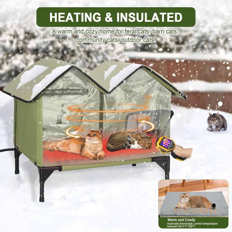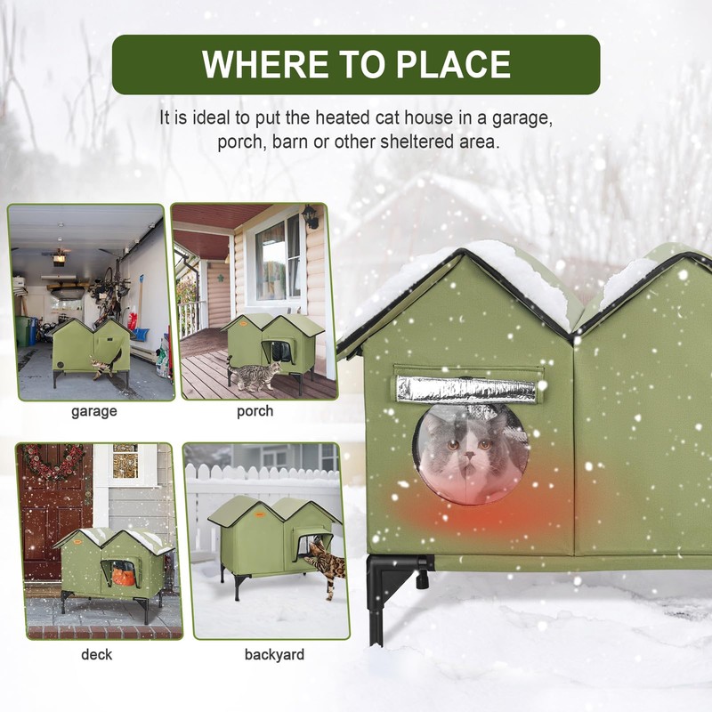 - 【Full-size Heating Pad Included】The heated outdoor cat house is equipped with a UL-tested, energy-efficient heating pad and thick insulation to keep cats warm through snow, wind, and freezing temperatures. Full-size heating pads throughout the house ensure warmth in every spot.