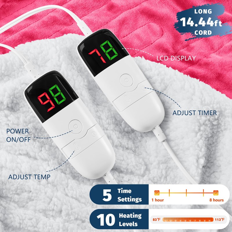 - 【10 HEATING LEVELS】: Find your perfect warmth about heated throw blanket with 10 different heating levels( 83℉-113℉) using LED controllers,which can intuitively display the temperature and customize the time(1/2/4/6/8 ).large heated blanket is designed with two zones, each with a LED controller, perfectly solving the different heating & timing requirements of electric throw blanket for adults.
