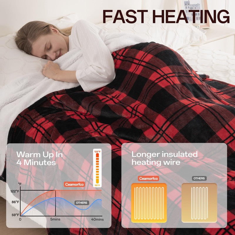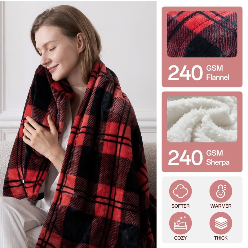 - High-quality fabric: The twin heated blanket uses 240gsm silky-smooth flannel and 240gsm comfortable and warm sherpa fabric, which is soft and thick, providing warmth even when not powered. This red and black checkered blanket does not shed or fade and is very durable.