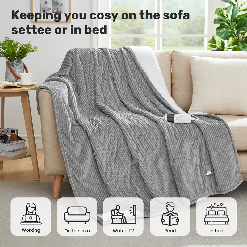 Transform your comfort with our electric throw blanket featuring a 15.1 foot power cord for ultimate flexibility. Ideal for use on beds, sofas, and in offices, this blanket offers 10 adjustable heat settings and 5 timer options via a convenient LED controller. Safety is our priority with ETL and FCC certifications, as well as advanced overheating and short-circuit protection. Made from luxurious 220gsm flannel and 200gsm sherpa and designed for easy maintenance, it ensures both safety and a cozy experience.