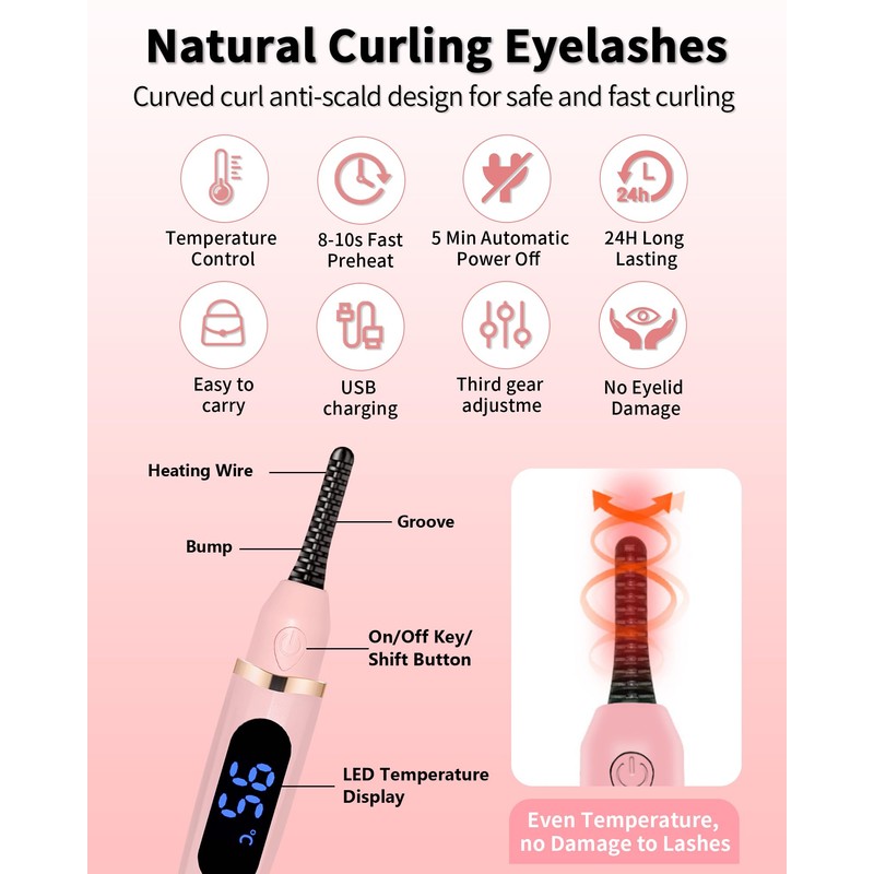 - 🌸【Careful Design and Safety Protection】This heated lash curler head features an ergonomic 15° curved anti-burn comb and a delicate brush head that fits perfectly to the curve of your eyelashes to create beautiful lashes. The heated eyelash curlers thermal protection slot extends the distance between the heating wire and the eyelid, avoiding damage to the skin or high-temperature contact with the eyelid, helping you to create long-lasting and delicate eyelash makeup safely and quickly.