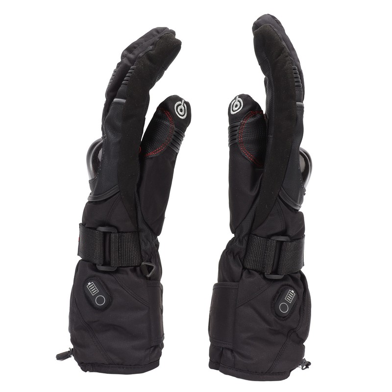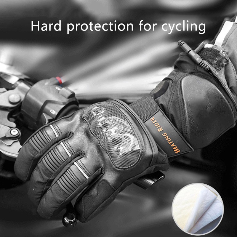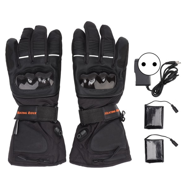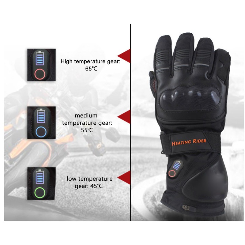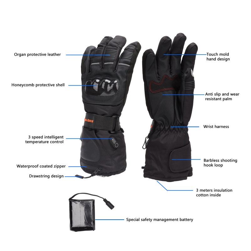 1、3 Temperature Adjustment: Heated gloves has a built in heating part that covers the five fingers and the back of the hand, with a warming temperature of 45℃‑65℃, which can be adjusted according to the outside temperature and your needs. 2、Touch Screen: Outdoor heated gloves are made of non slip touch screen material on the fingertips, so you can directly operate the touch screen device, make phone calls and play with your cell phone outdoors, which is convenient and warm. 3、Overall Practical: Non slip and wear resistant palm, good elasticity, strong grip; wrist with a wide three dimensional hook loop adjustment strap, tighten more warm; three dimensional protective shell on the back of the hand, impact resistance. 4、Windproof and Waterproof: Electric gloves are made of water resistant fabric on the surface and lined with warm cotton, windproof, waterproof, cold and warm, breathable, comfortable and soft, and can effectively resist cold weather. 5、Pockets and Rechargeable: Heated motorcycle gloves are designed with waterproof zipper pockets on the outside to hold batteries; equipped with two 6000mah rechargeable batteries with 4‑8 hours of battery life. 6、Application: Heated gloves can be used for winter riding, skiing, hunting, climbing and other outdoor activities; suitable for men and women, can be a perfect practical gift for birthdays, Christmas, Thanksgiving and other special scenes.