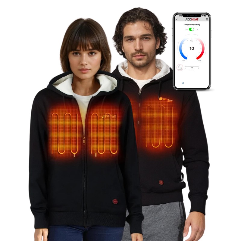 - Experience complete warmth control with our intuitive Bluetooth app for the venture heated hoodie! Adjust between 10 precise heat settings directly from your phone, or use the built-in buttons for manual control. Whether you're braving extreme cold or just need a little extra warmth, customize your comfort in any environment.