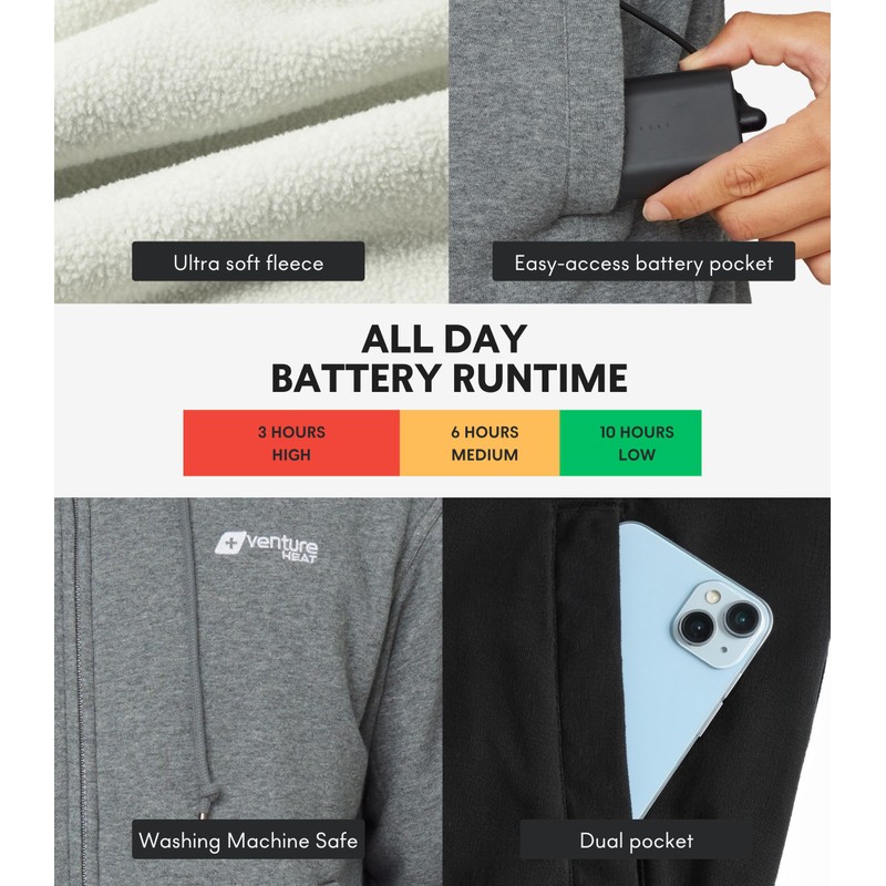 - Our venture heat hoodie meet rigorous safety standards with a heat-resistant lithium-ion battery and built-in overheat protection, giving you peace of mind in any situation. The discreet heating controls are easy to access, and the battery pocket is thoughtfully designed for comfort and convenience, so you can focus on enjoying your time outdoors without worrying about safety.