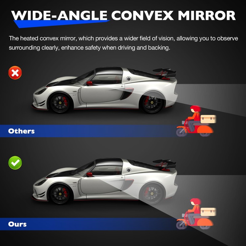 - đăWide-angle Convex MirrorăThe heated convex mirror, the chromed lens boosting glass surface clarity,offers you a broader and clearer vision, allows you to observe surrounding clearly, that you can drive and backing with confidence