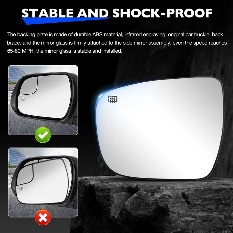 - đ ăStable And Shock-proofăThe backing plate is made of durable ABS material, infrared engraving, original car buckle, back brace, and the mirror glass is firmly attached to the side mirror assembly, even after the speed reaches 65-80 MPH, the view mirror is stable