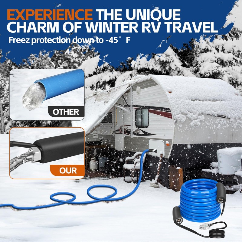 - 【MUTIL-SCENE APPLICATION】The heated water hose of rv accessaries can prevent water from freezing down to -45℉ (-42.7℃), and its unique intelligent temperature control system thaws ice into wate gradually. Heated water hose is made certified drinking water safe hose. It can be used in RV,camping,chicken coops, homes,gardens and on trips,Helping countless families stay away from the plight of water shortage in extreme cold weather.