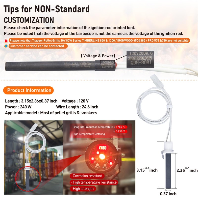 - Our ignition rods are compatible with 90% of pellet grills on the market. Please check the parameter information on your original ignition rod to match our latest ignition rod. Our hot rod igniter is 120V, 240W. Please note that Traeger pellet grills TIMBERLINE 850 & 1300, IRONWOOD 650 & 885, PRO 575 & 780 are 20V 80W and are not suitable for our ignition rods.