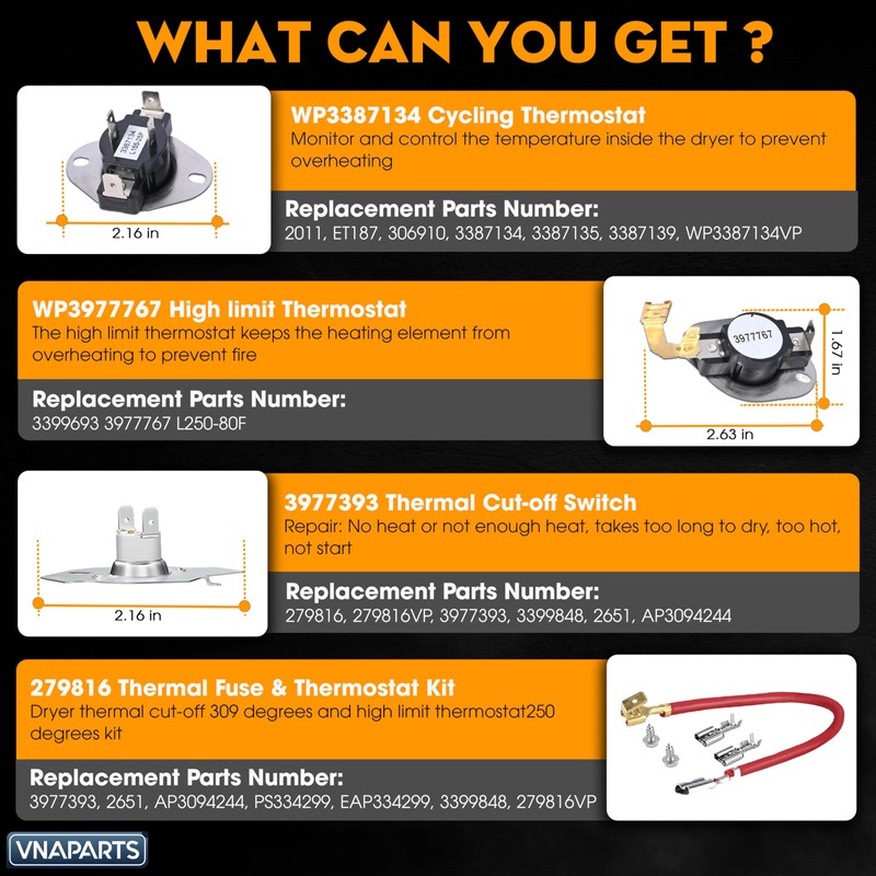 - 🛠️ Full Dryer Heating Element Kit – This dryer heating element replacement kit includes: 1 x Dryer Heating Element – Rated at 5400W 240V, made with premium nickel-chromium coils for uniform heating. 1 x WP3392519 Thermal Fuse – Prevents overheating and ensures dryer safety. 1 x 3977393 Thermal Fuse – Ensures temperature regulation for optimal drying. 1 x WP3977767 High-Limit Thermostat – Protects dryer from excessive heat damage. 1 x WP3387134 Cycling Thermostat – Maintains consistent drying temperatures.