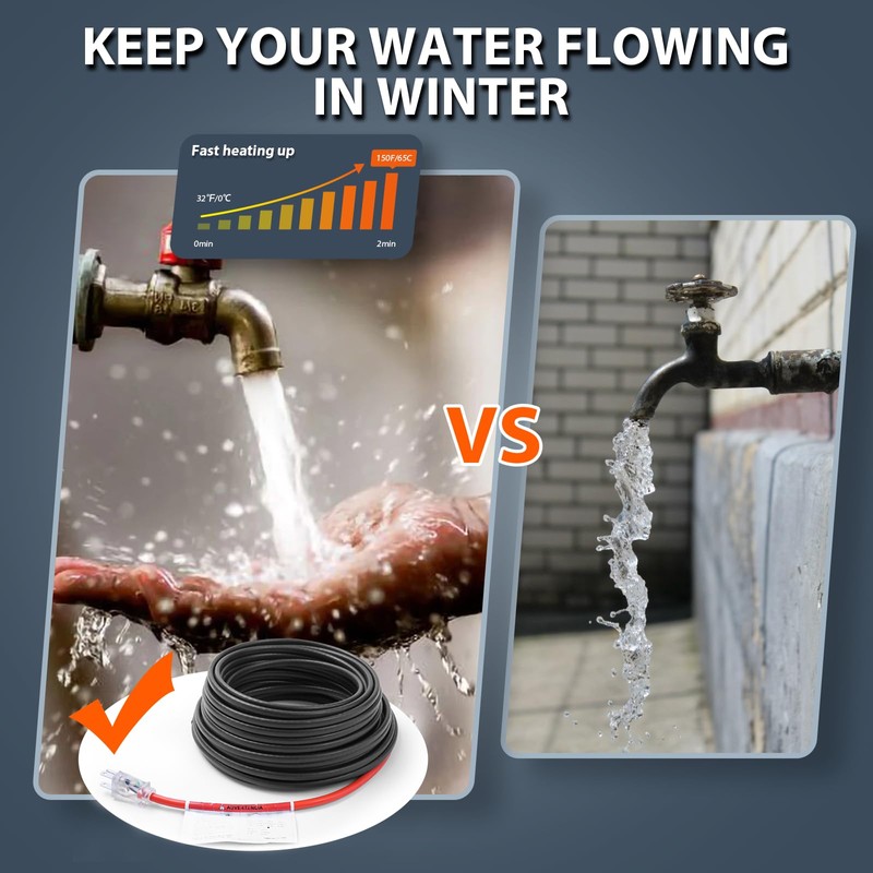 - Smart Temperature Control Technology : 3w/ft. The heat tape for water pipes stands out with its cutting-edge technology, allowing it to automatically adjust its heating power based on the surrounding environment. When temperatures drop below 3 degrees Celsius, the pipe heat tape activates, providing essential insulation to prevent freezing. This intelligent feature ensures optimal energy usage, making it an efficient and reliable choice for pipe freeze protection.