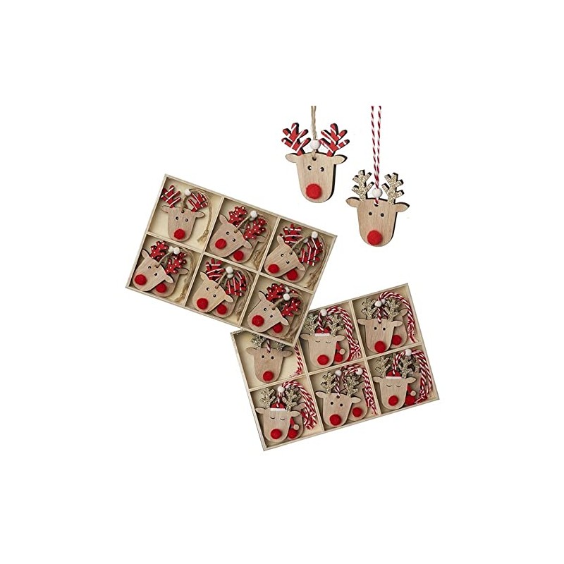 • Set of 12 Christmas Reindeer shaped wooden Christmas tree decorations
