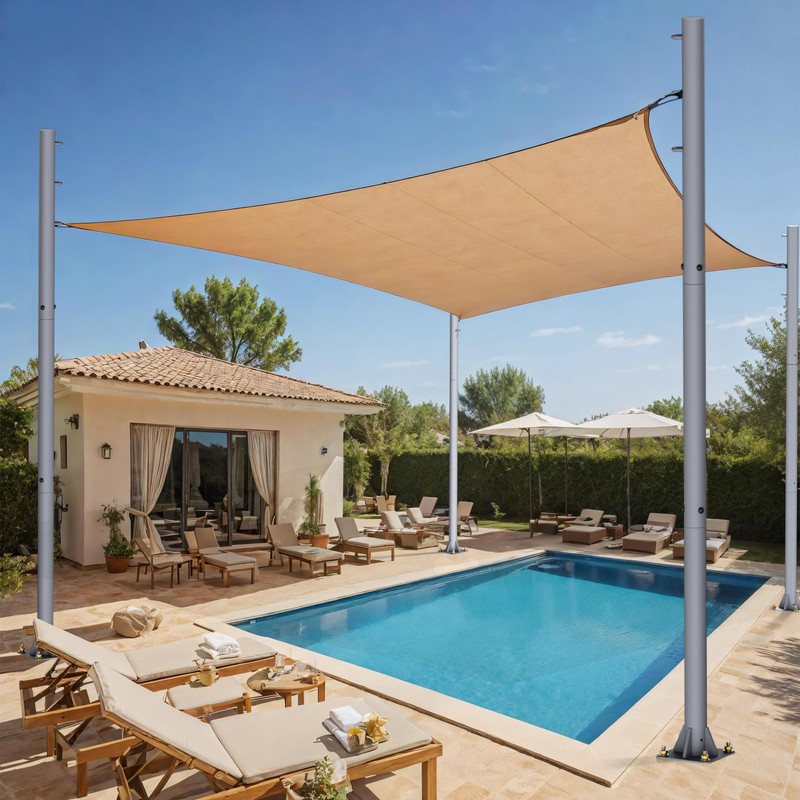 - ✓ 10-MINUTE TOOL-FREE SETUP Pre-drilled holes and included hardware allow quick installation on concrete surfaces—simply secure the poles in minutes. Adjustable height (9-10FT) adapts to uneven ground or custom shade angles. *NOTE: For grassy/soft soil, pair with ground anchors (sold separately) for maximum stability.