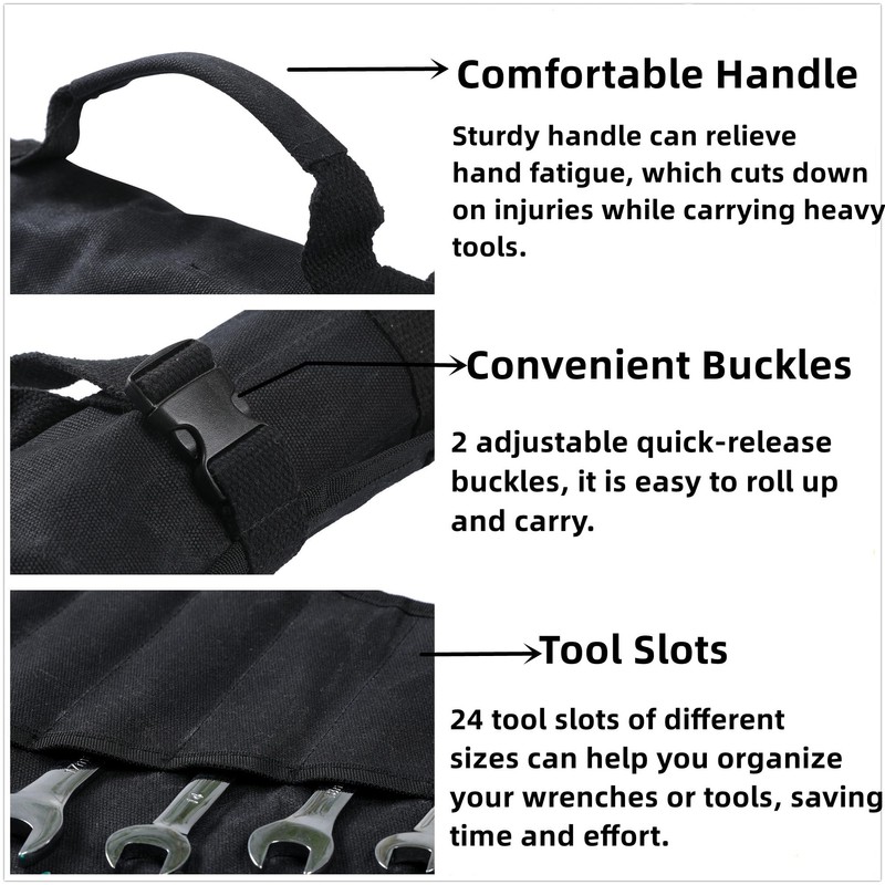 - 24 POCKETS: 24 pockets to hold SAE/metric wrench set, allen wrench, ratchet wrench, adjustable wrench and other hand tools