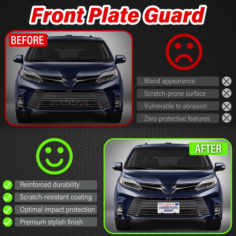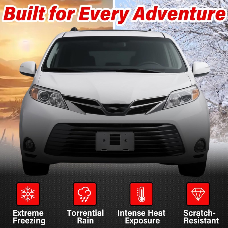 - PERFECT COMPATIBILITY:Our license plate holder and frame bracket are compatible with 2018-2020 Toyota Sienna, Precisely molded, it perfectly conforms to the curves of the vehicle's front bumper, eliminating the need for any adjustments during installation. The secure locking mechanism of the bracket ensures a rattle-free attachment, safeguarding both the license plate and the existing components of the vehicle.