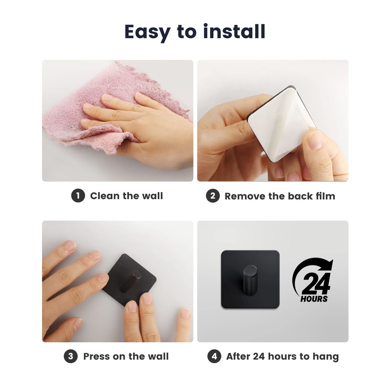 - 【Simple Installation】Step 1: Take your hook out of the box. Step 2: Peel off the back adhesive protective sheet. Step 3: Stick it where you need it. So simple!