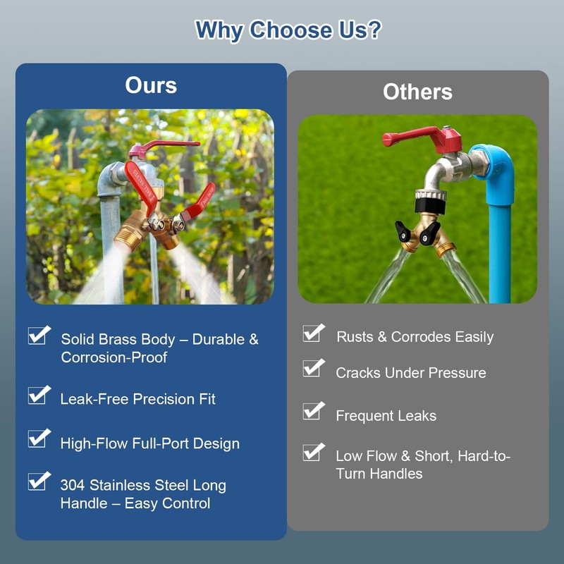 With extra-large stainless steel handles, controlling water flow is easy—even with gloves or wet hands. No tools, no strain—just a smooth, one-finger turn to control each outlet independently.
