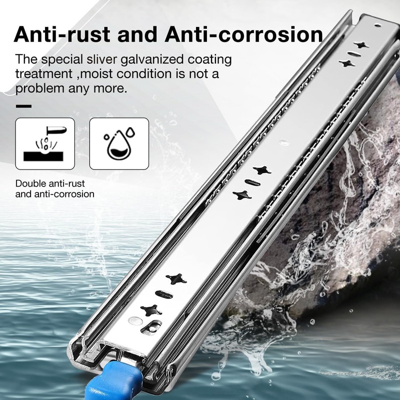 - 【With hold-still lock & Detachable】 There is a blue handle to lock and unlock.When it is fully extension or fully closed,the slides will be hold still automatically (in locking state),which can prevent from sliding casually and keep your drawer stable and safe. Press the lock handle gently,it's unlocked and get back in free sliding; Detachable: By press-and-hold the lock handle,and pull outward in the meantime ,the 3rd track(the narrowest section) can be separated.