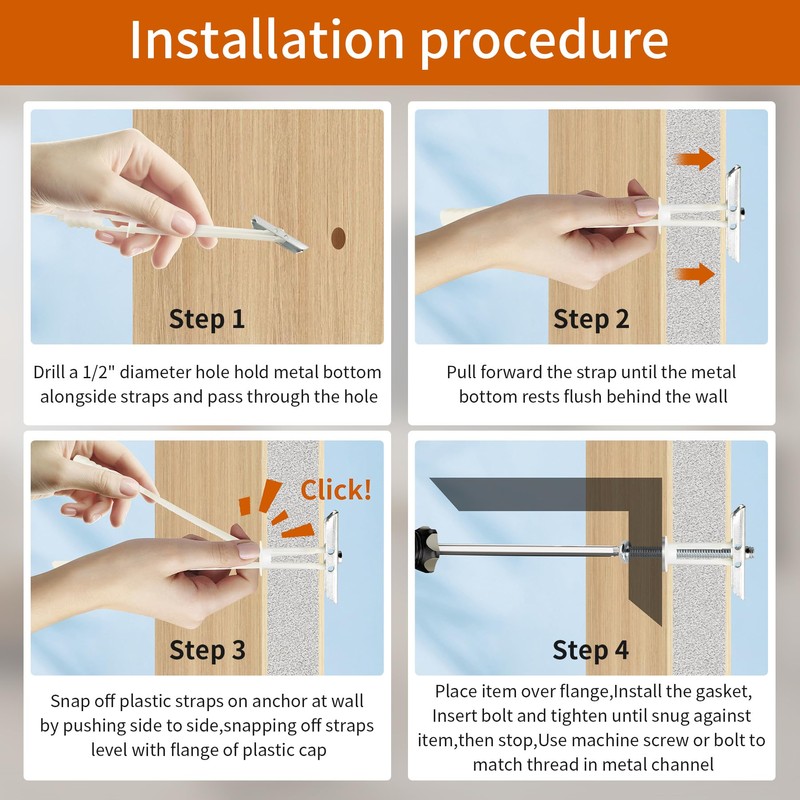 - 【Fast & Easy Installation】No hassle setup—simply drill a 1/2-inch hole, insert the anchor, add the washer, and tighten the screw. Suitable for both DIY enthusiasts and professional contractors, with clear instructions included.