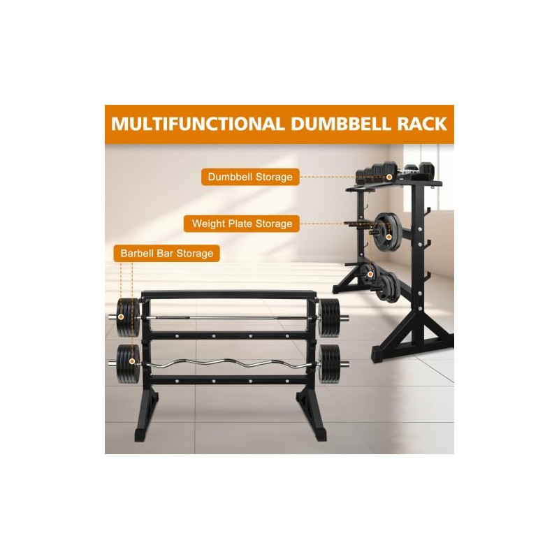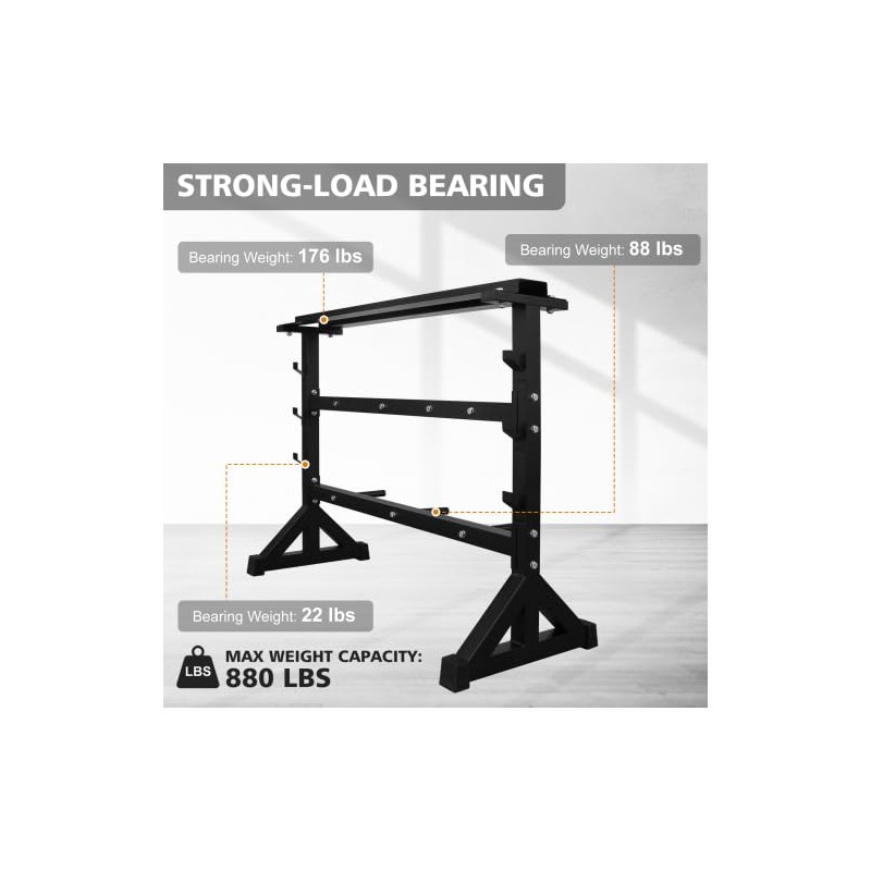 • Industrial-Grade Construction: Reinforced 2mm steel tubing forms this dumbbell rack's rectangular frame, engineered for heavy-duty stability. Compact footprint withstands 880+ lbs total load, securing plates and barbell storage without sway.