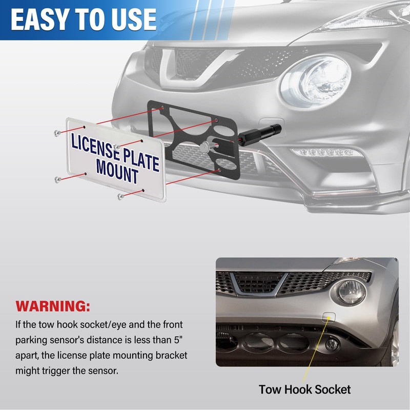 - QUICK NO-DRILL INSTALLATION: Our front license plate frames directly install on the front tow hook without drilling. Includes all hardware and clear instructions for a hassle-free, quick installation
