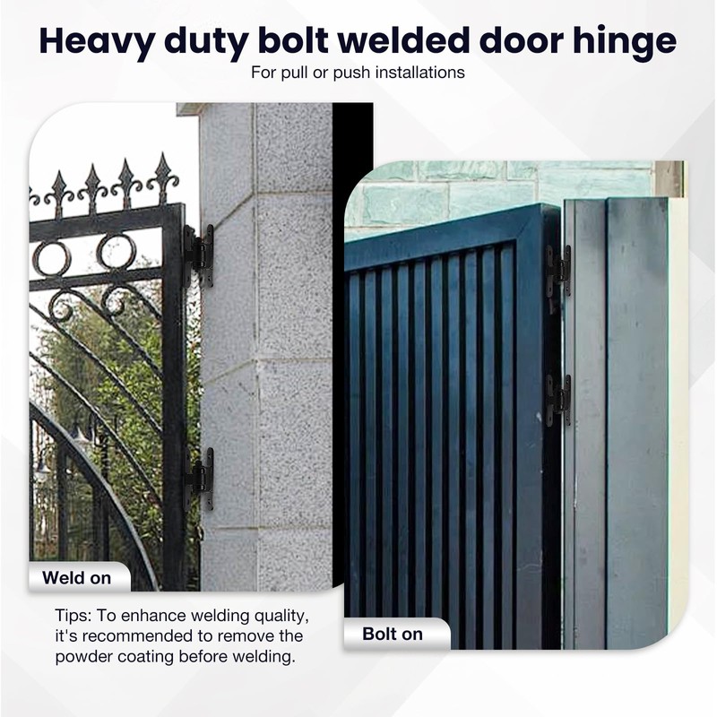 - Bolt-On or Weld-On: Our Ultra-Heavy Duty Gate Hinges Swing 180 Degrees and Fit Gates Made of Any Material - Pull or Push Installation on Plastic, Vinyl, Aluminum, Steel, Iron, or Wood. Secure with 12" (or M12) Bolts or Weld Directly. Bolts Not Included.