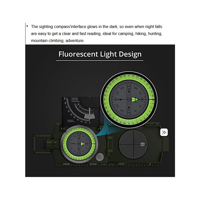 *The sighting compass'interface glows in the dark, so even when night falls are easy to get a clear and fast reading, ideal for camping, hiking, hunting,mountain climbing, adventure..