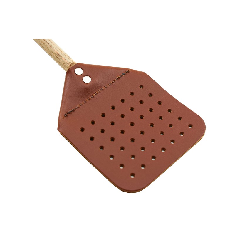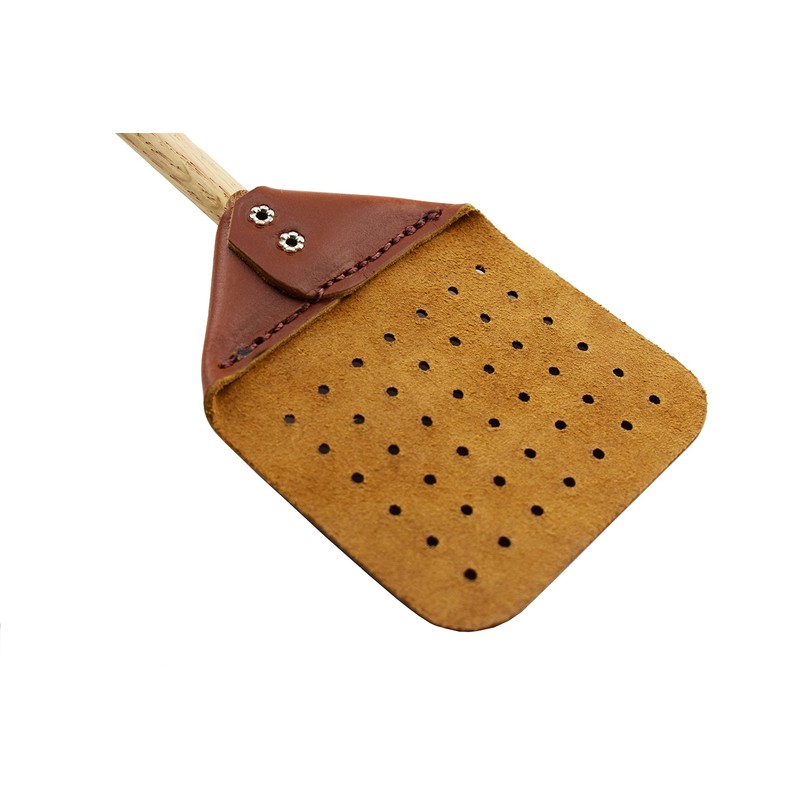 • Leather fly swatter with oak wooden handle. Overall length is 18 inches and the leather paddle measures 4 inch by 5 inch. Features a leather string to hang the swatter when not in use.