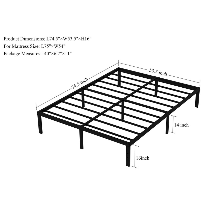 - Product Feature: Full Size(inches): L74.5"×W53.5"×H14", For Mattress Size L75"×W54". Full size bed frame package measures 40x6.7x11 inch, weighs 44 lbs max weight capacity. Our bed frame with steel slat support, and steel tube are thicker than other products, supports up to 3500 lbs.